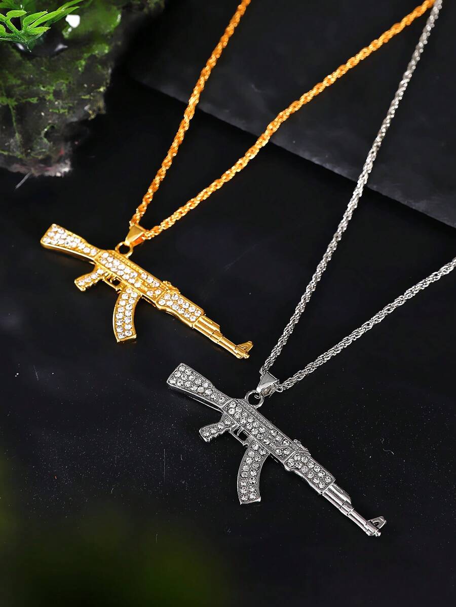 ΑΚ-47 κόσμημα από ανθεκτικό κράμα μετάλλου με λεπτομέρεια διαμαντιού σε κλίμακα και πανομοιότυπο με το αληθινό πολυβόλο σε ασημένια/χρυσή απόχρωση, το συγκεκριμένο κόσμημα λαιμού είναι για αυτούς που θέλουν να ξεχωρίζουν. Μια πολύ καλή επιλογή για εσάς η για δώρo.